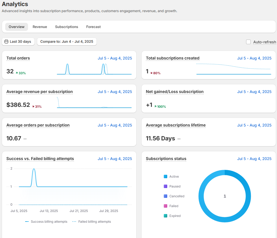 Together, these two types give you a complete picture of how many subscription-related orders your store has processed within the selected period.