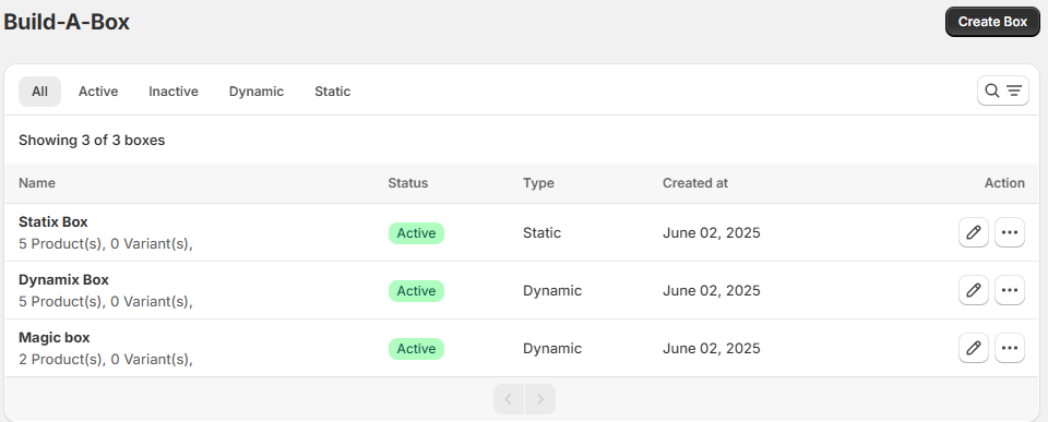 You can view, manage, and edit all your boxes here, track their **status** (Active/Inactive), and sort by box type. Use the **Create Box** button to launch new offerings that drive engagement and retention.