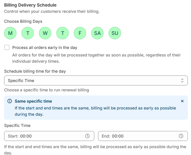 * Set early charge hours and specify your store’s time zone to align billing schedules.